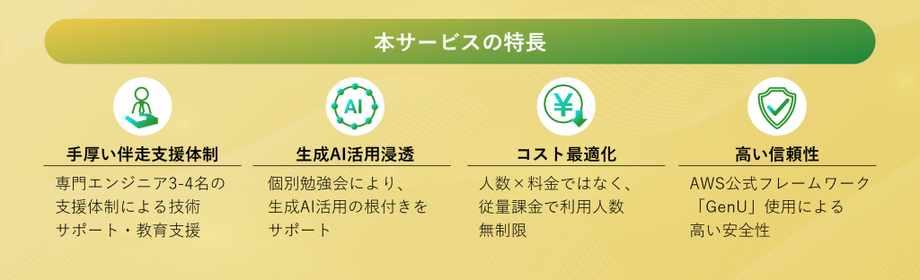 生成AIの社内導入だけでなく、導入後の社内活用・利用定着のご支援も含め伴走的にサポートさせていただくサービスとなっております。